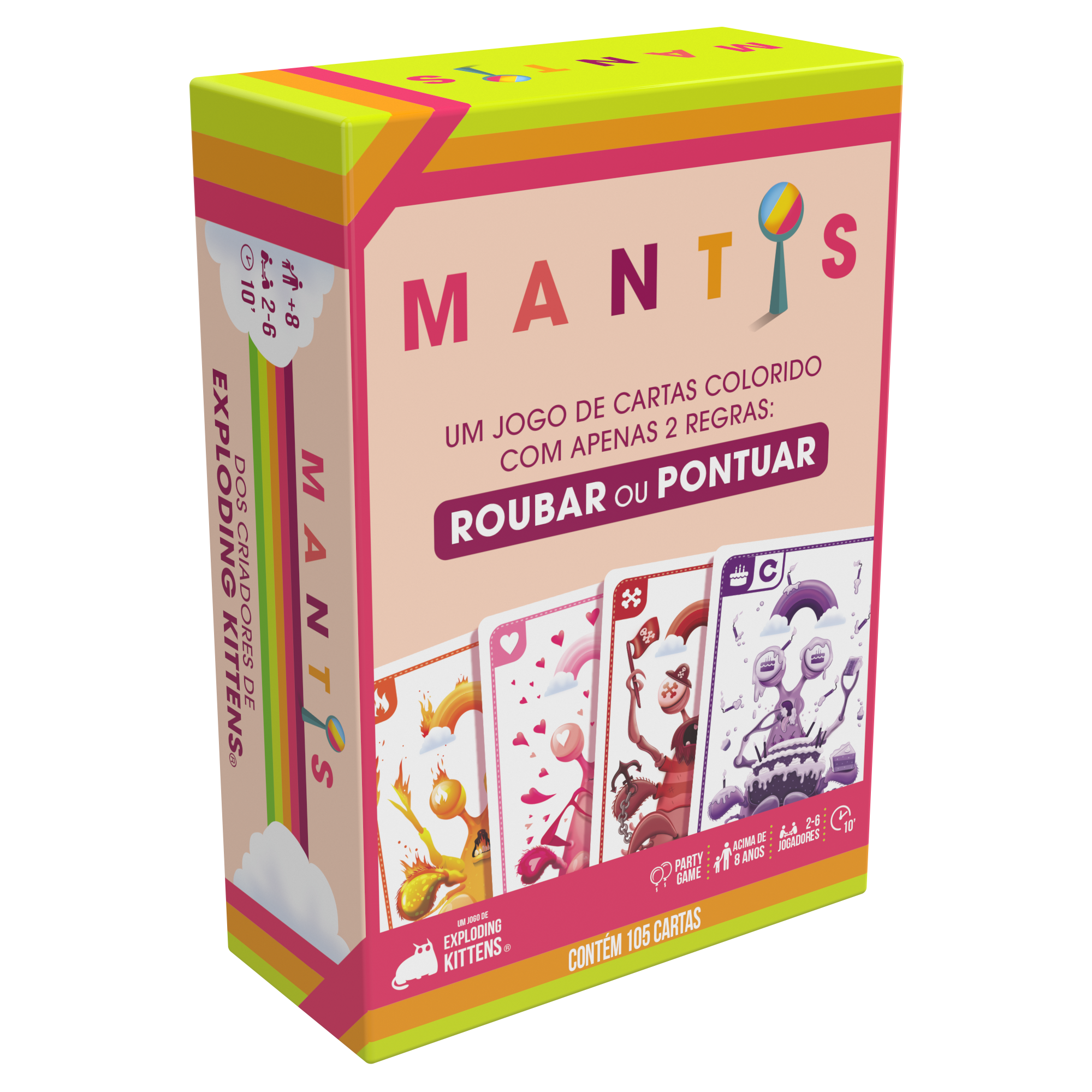 Colorido, rápido e cheio de reviravoltas, Mantis é um jogo de cartas perfeito para todas as idades! Criado pelos mesmos designers de Exploding Kittens, ele mistura simplicidade nas regras com muita diversão e imprevisibilidade. O objetivo é simples: colecionar conjuntos de cartas coloridas ou roubar pontos dos adversários. Mas cuidado, cada jogada pode mudar completamente o rumo da partida!