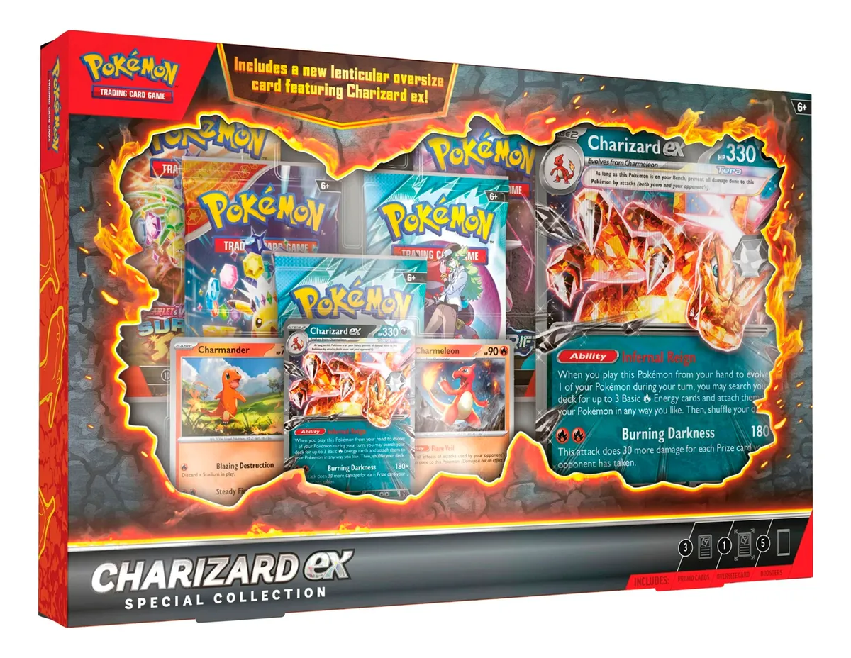 Charizard ex elimina a vantagem do adversário com o poder de fogo astuto de um Pokémon do tipo Trevas. Evolua de Charmander e Charmeleon e use sua poderosa Habilidade e ataque para uma virada estrondosa. Este conjunto flamejante também inclui 5 pacotes de booster do Pokémon Estampas Ilustradas e um card lenticular gigante com o próprio Pokémon Chama; mova o card para frente e para trás para ver Charizard ex atacar.